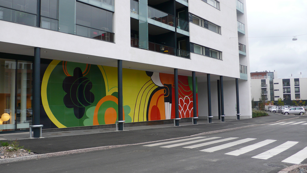 public artworks WONDERLAND, a permanent facade art work at Muotoilijankuja 14 in the area of Arabianranta in Helsinki. The commission was made in 2009 and the artwork is printed on aluminum, its height 480 cm and width 20 meter. Share this: Share on Facebook (Opens in new window) Facebook Email a link to a friend (Opens in new window) Email